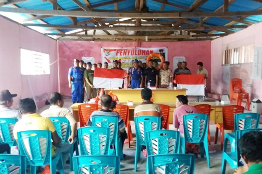 Manado: Satpolairud Polres Kepulauan Talaud, Sulawesi Utara memberikan bendera Merah Putih dan teks Pancasila terhadap para nelayan di Desa Tarun, Kecamatan Melonguane Barat, Talaud, Sulewesi Utara, Kamis, 6 September 2018.