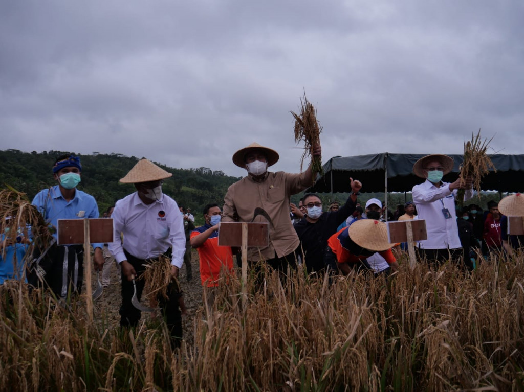 Sumba Barat Daya: Wakil Ketua DPR Rachmat Gobel melakukan panen padi dengan pupuk nonsubsidi di Sumba, Nusa Tenggara Timur, Senin, 5 April 2021. Panen padi itu bekerja sama dengan PT Pupuk Kaltim dan sejumlah pihak lain yang menginisiasi program pertanian tanpa pupuk subsidi.