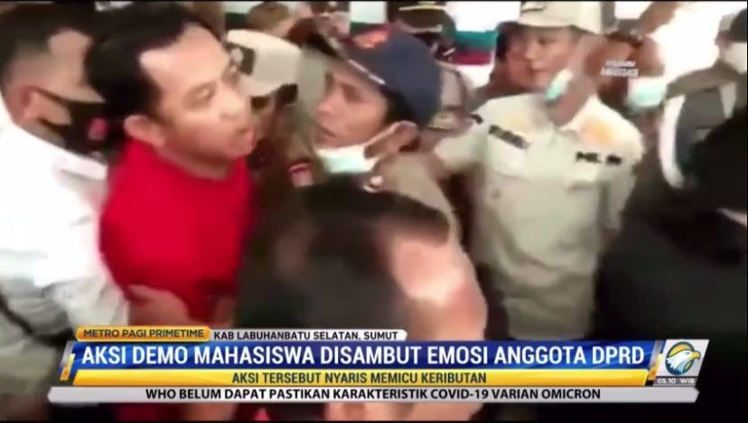 Medan: Aksi emosional dan tidak terpuji diperlihatkan seorang wakil ketua DPRD Labuhan Batu Selatan. Emosinya tersulut saat menanggapi aksi demo mahasiswa di Gedung DPRD Labuhan Batu Selatan, Senin, 29 November 2021 sore. Aksi tersebut nyaris memicu keributan.