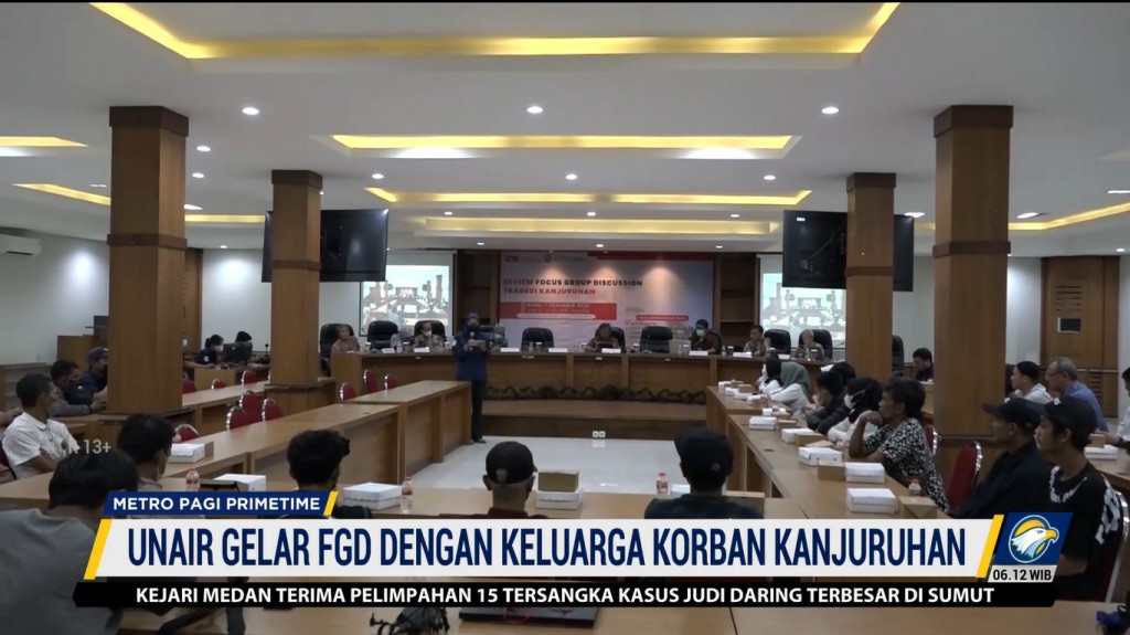 Malang: Fakultas Hukum Universitas Airlangga menggelar focus froup discussion (FGD) untuk keluarga korban tragedi Kanjuruhan, Malang, Jawa Timur. Sebanyak 16 perwakilan keluarga korban tragedi Kanjuruhan dihadirkan dalam diskusi tersebut.