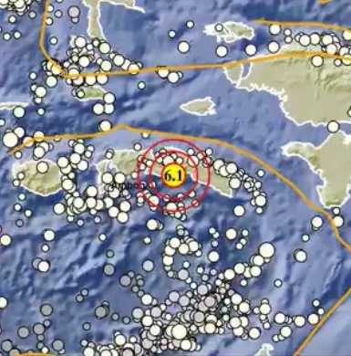 Posisi gempa berada di 3.39 Lintang Lintang Selatan (LS), 129.56 Bujur Timur (BT) dengan kedalaman 10 kilometer.