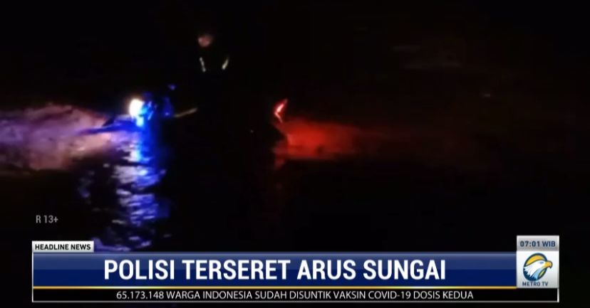 terseret arus sungai yang cukup deras saat mengawal vaksinasi di wilayah terpencil. Beruntung anggota polisi berhasil diselamatkan sehingga tidak tenggelam.