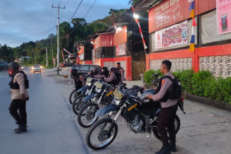 Personel Polres dengan menggunakan motor tampak bersiaga di sejumlah APMS di Kota Wasior hingga malam hari.