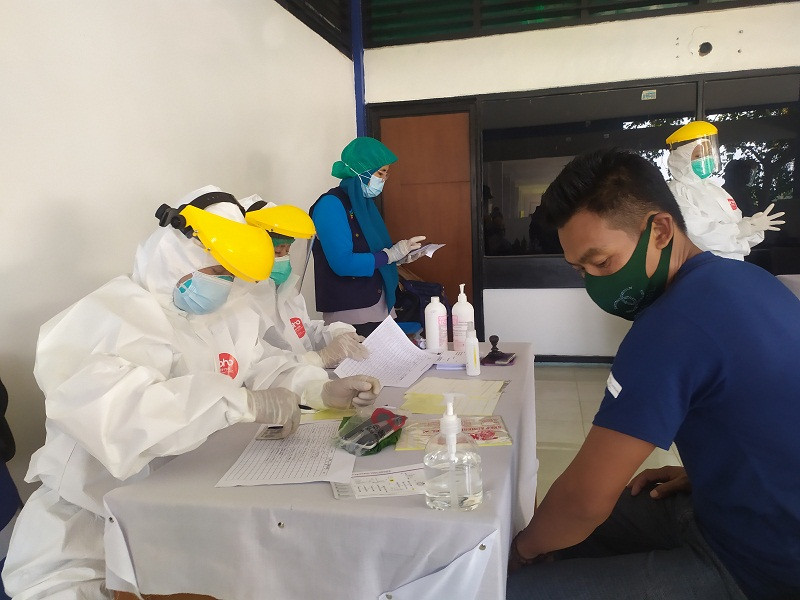 tes rapid antigen kepada sopir, kondektur bus, dan warga yang datang dan pergi melalui Terminal Baranangsiang, Kota Bogor, Jawa Barat.