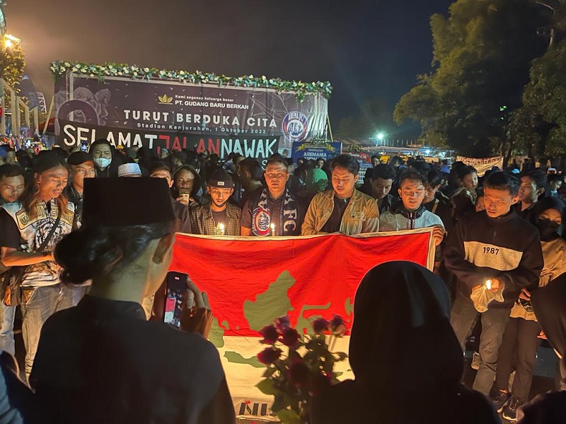 Malang: Badan Eksekutif Mahasiswa Nusantara (BEM NUS) menggelar doa bersama dan menyalakan 1.000 lilin sebagai wujud empati dan belasungkawa tragedi di Stadion