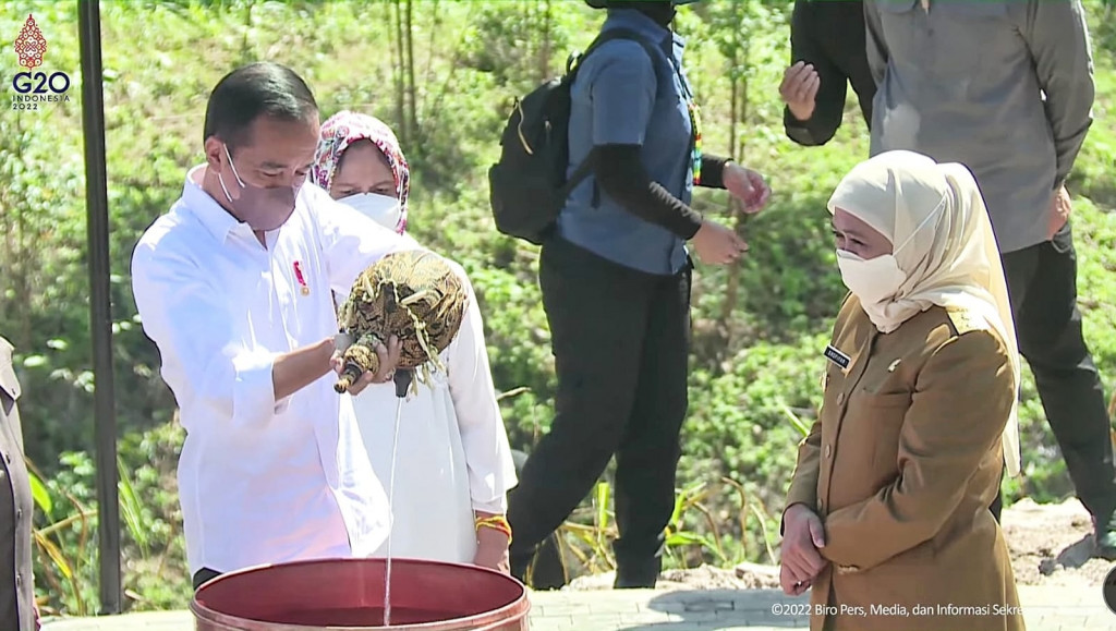 Surabaya: Gubernur Jawa Timur Khofifah Indar Parawansa menyatukan tanah dan air dari Bumi Majapahit di Ibu Kota Negara (IKN) Nusantara, Kalimantan Timur, Senin, 14 Maret 2022. Tanah itu kemudian diserahkan Khofifah kepada Presiden Jokowi, untuk kemudian dituang dan dipersatukan ke dalam Kendi Nusantara.