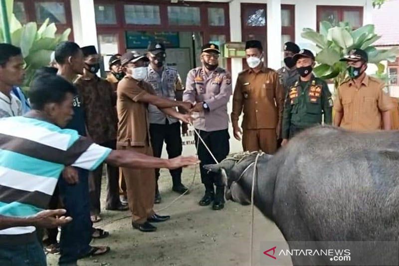 Kapolres Simeulue AKBP Pandji Santoso di Simeulue memberi hadiah kerbau kepada Desa Babussalam, Kecamatan Teluk Dalam dan Desa Lhok Dalam, Kecamatan Alafan karena capaian vaksinasi itu.