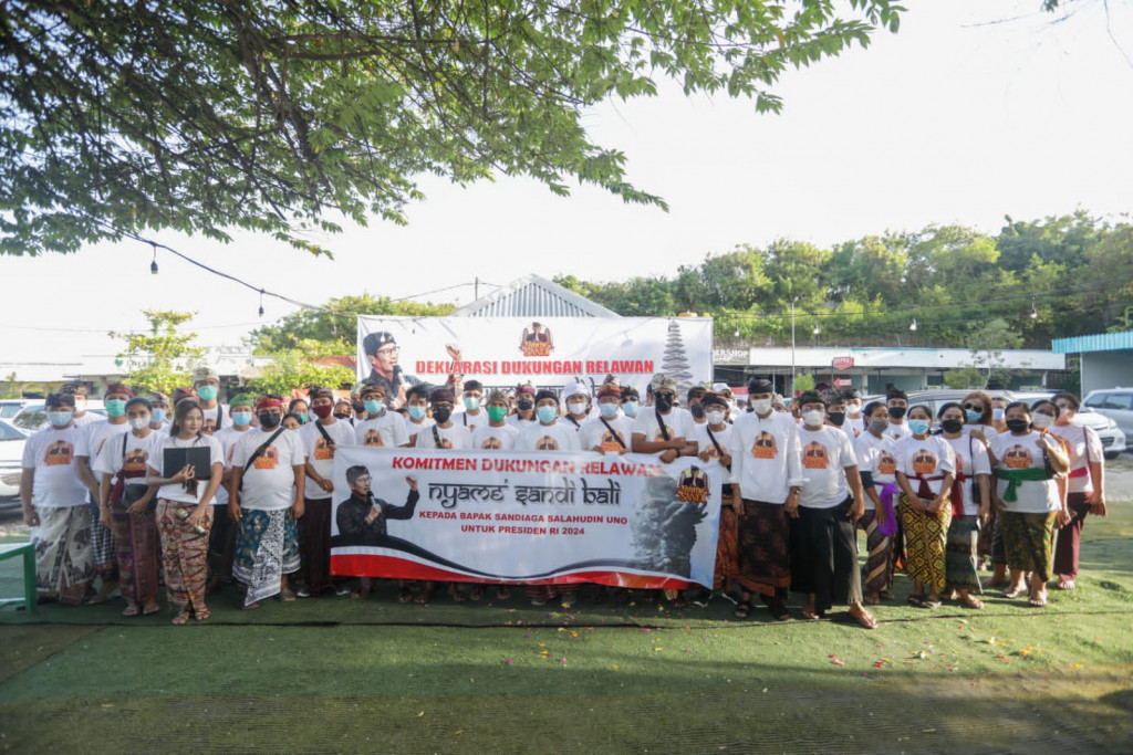Bali: Ratusan relawan dari pelaku transportasi wisata hingga milenial di kawasan Bali Cliff, Ungasan, Kabupaten Badung, Bali mendukung Sandiaga Uno untuk maju di Pemilihan Presiden (Pilpres) 2024. Sandiaga dinilai sosok pemimpin yang tepat mengatasi masalah perekonomian di Indonesia.