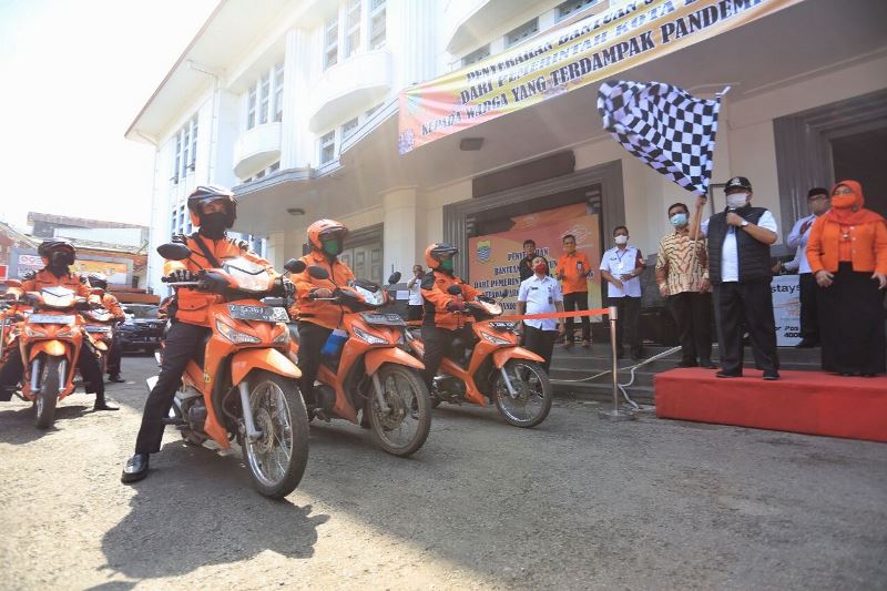 Bandung: Wali Kota Bandung, Oded M. Danial, melepas secara simbolis para petugas pos yang akan mengantarkan bantuan pemerintah untuk warga terdampak ekonomi pada masa wabah Covid-19. Pelepasan dilakukan di Gedung Kantor Pos Besar Bandung, Jalan Asia Afrika, Rabu, 22 April 2020.