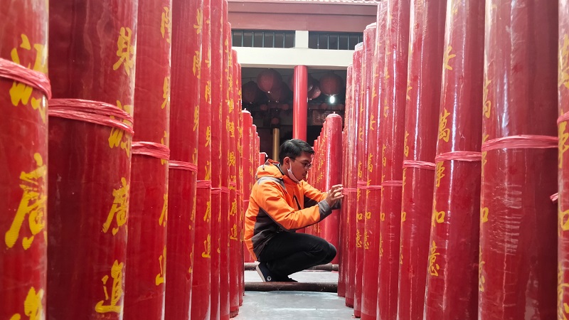 Pantauan di lapangan, sejumlah pengelola bergotong royong menata lilin-lilin berwarna merah dengan berbagai ukuran. Lilin-lilin itu merupakan titipan umat Tionghoa yang akan beribadah menyambut tahun baru.