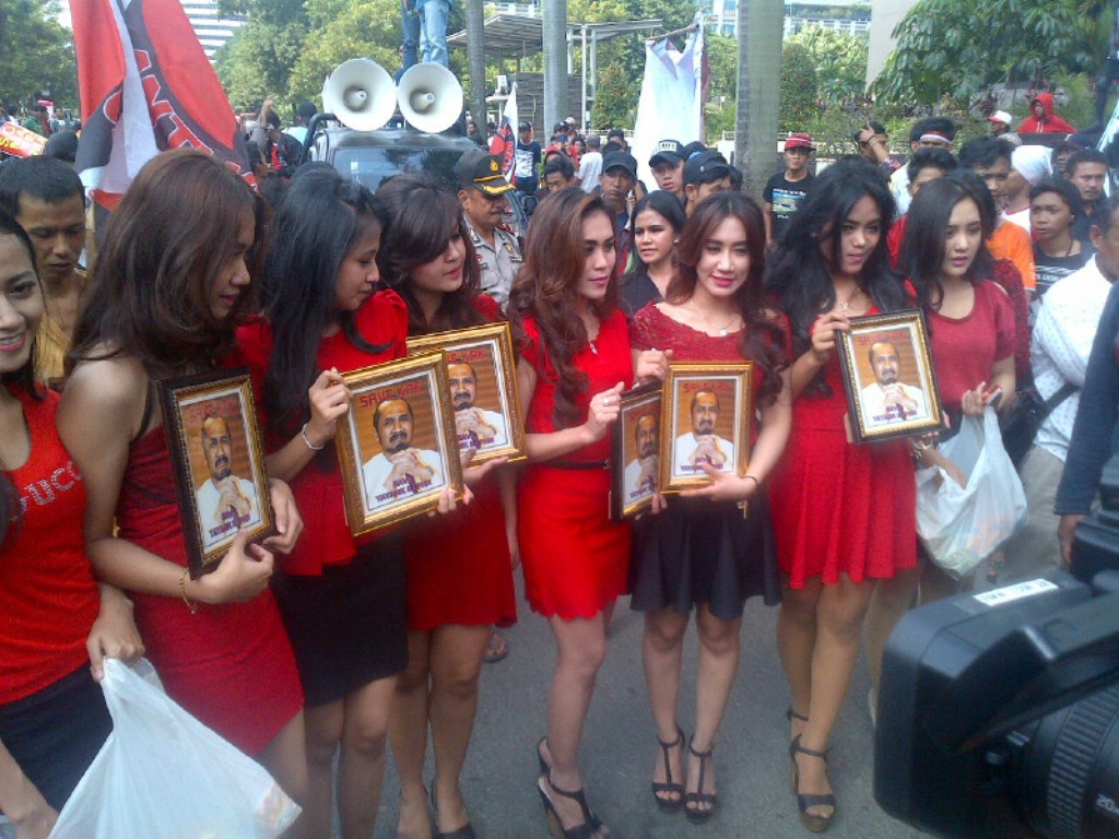 Wanita seksi dengan balutan baju berwarna merah dan rok ketat berwarna hitam itu tebar pesona dengan membawa figura foto yang bergambar Abraham Samad. "Save yayank bephih". Mereka berkeliling dengan membagi-bagikan tisu kepada sejumlah orang di yang berada di halaman Gedung KPK.