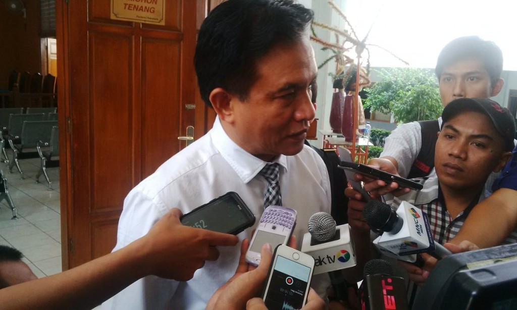 Yusril Ihza Mahendra bersama dua orang timnya selaku tim kuasa hukum Dahlan Iskan membacakan permohonan gugatan praperadilan selaku kuasa hukum.