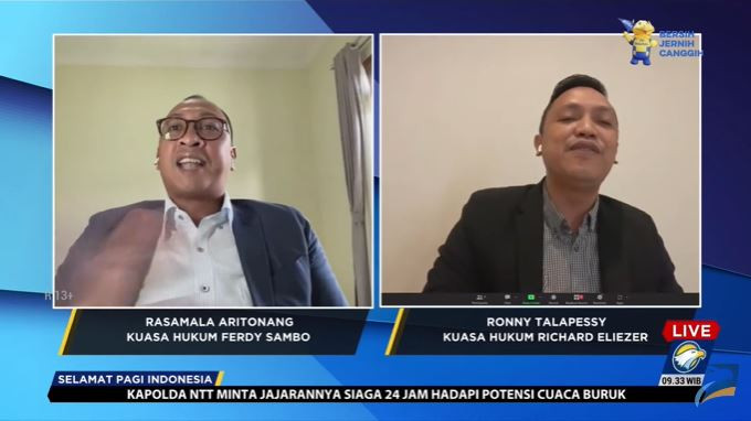 Jakarta: Kuasa hukum Ferdy Sambo, Rasamala Aritonang; dan kuasa hukum Richard Eliezer Pudihang Lumiu, Ronny Talapessy, terlibat adu mulut saat diwawancari di Metro TV. Mereka beradu argumen terkait keterangan Eliezer sebagai terdakwa di persidangan kasus dugaan pembunuhan berencana Brigadir Nofriansyah Yosua Hutabarat (Brigadir J), di Pengadilan Negeri Jakarta Selatan, kemarin.