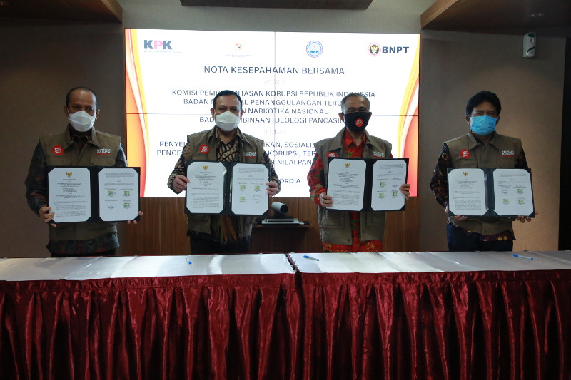Nota kesepakatan ini ditandatangani Ketua KPK Fili Bahuri, Kepala BNPT Boy Rafli Amar, Kepala BNN Heru Winarko, dan Kepala BPIP Yudian Wahyudi.