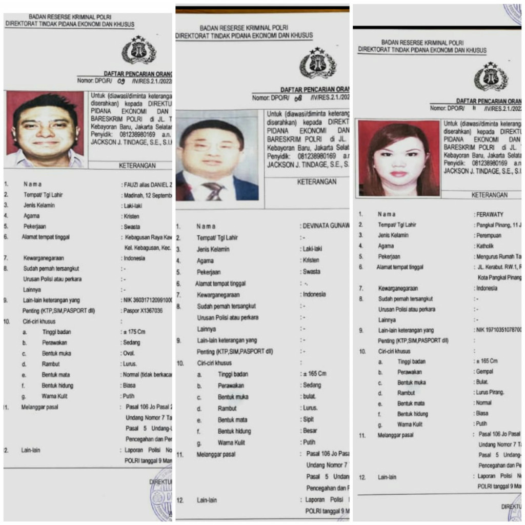 Gatot mengatakan penerbitan DPO terhadap tersangka Devin tertuang dalam nomor DPO: R.08/IV/Res/2.1/2022/Dit Tipideksus, tanggal 4 April 2022. Kemudian, Fauzi dengan nomor DPO: R.09/IV/Res/2.1/2022/Dit Tipideksus, tanggal 4 April 2022. Lalu, Ferawaty dengan nomor DPO: R.010/IV/Res/2.1/2022/Dit Tipideksus, tanggal 6 April 2022.