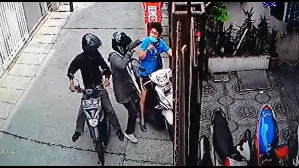 Perampokan itu terekam CCTV di depan rumah korban. Dalam rekaman, tampak dua pelaku berboncengan memepet korban yang masih berada di atas motornya. Korban saat itu hendak membuka pintu gerbang rumahnya.