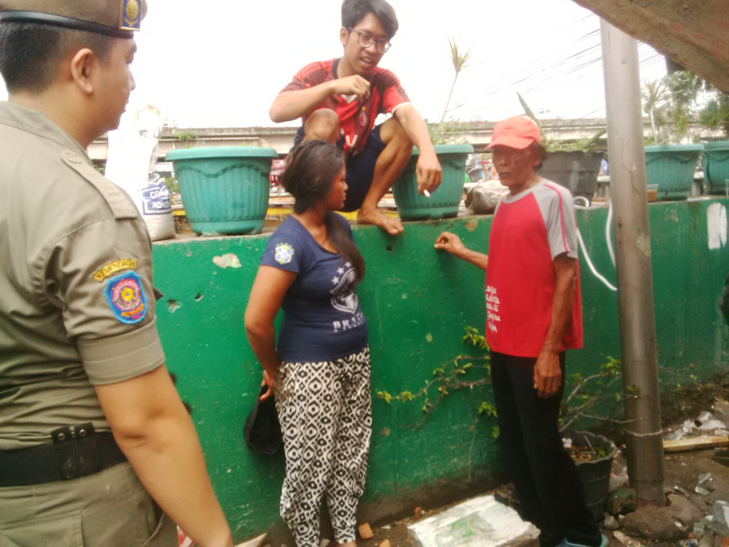 Seorang pria dan seorang anggota Satpol PP menolong remaja putri berambut panjang ini. Sedangkan warga lainnya hanya menertawakan.