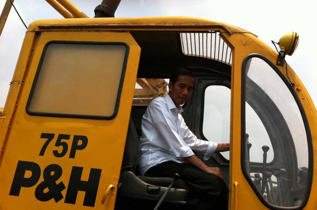 Jokowi menaiki alat berat berbentuk eskavator ini, sesaat setelah menekan tombol sirine peresmian rusun. Meski tidak bisa mengoperasikan, calon pengganti SBY tersebut tampak bergaya di depan alat kemudi.