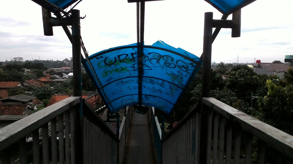Jembatan yang menghubungkan Jalan Raya Lenteng Agung Timur dan Jalan Raya Lenteng Agung Barat itu tampak mengkhawatirkan. Besi jembatan sudah berkarat dan berlubang. Coretan memenuhi atap jembatan.