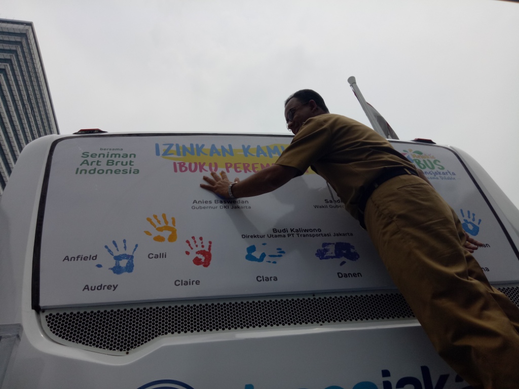 Jakarta: Gubernur DKI Jakarta Anies Baswedan meresmikan bus gandeng TransJakarta edisi Hari Kartini. Bus dengan dekorasi lukisan tangan anak-anak berkebutuhan khusus itu segera 'mengaspal'.