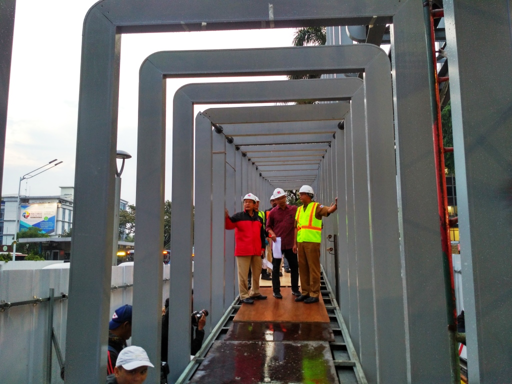 Dia datang didampingi Asisten Pembangunan Yusmada Faizal dan Wali Kota Jakarta Pusat Bayu Megantara. Selepas hujan sore tadi, Anies langsung menuju JPO dan mengecek langsung progres pekerjaan.