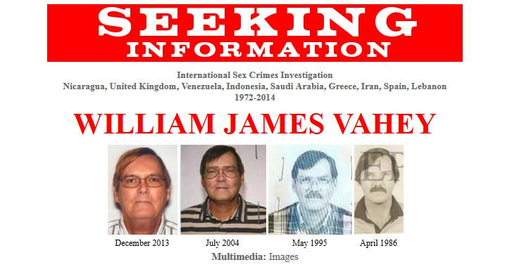Dari komputer milik Vahey, FBI menemukan 90 foto pornografi anak laki-laki yang usianya antara 12—14 tahun. “FBI meminta bantuan publik untuk mengidentifikasi korban dari tersangka sejumlah kasus kekerasan anak, yang pernah mengajar di sejumlah sekolah Amerika di luar negeri, di sembilan negara berbeda sejak 1992. Korban-korbannya diperkirakan berusia 12—14 tahun yang mungkin tidak memahami apa yang terjadi terhadap mereka,” demikian FBI menulis dalam situsnya.