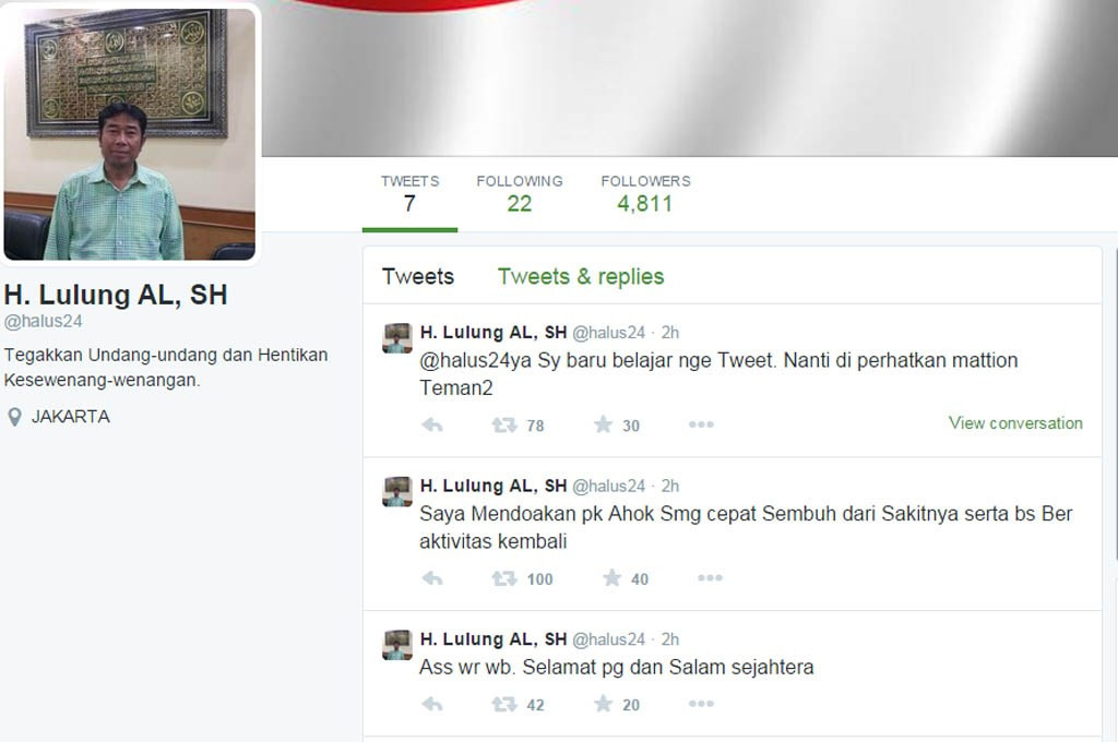 Hingga kini, akun @halus24 telah memiliki 4.591 follower. Dalam cuitannya, Haji Lulung mengaku sedang belajar menggunakan Twitter. Tak lupa, ia mendoakan Gubernur DKI Jakarta segera pulih dari sakit demam berdarah.