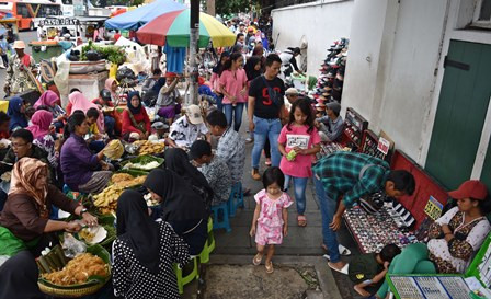 Aktivitas jual beli antara pedagang, dan wisatawan kerap mengganggu akses jalan. Para pejalan kaki harus berdesak-desakan hanya untuk bisa melintas. (ADI)