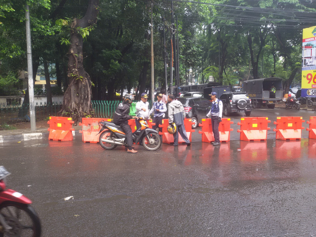 Kepolisian mengalihkan pengendara dari arah Bandengan Selatan menuju Teluk Gong ke Jalan Jembatan Dua dilanjutkan ke Jalan Latumenten dan Grogol.