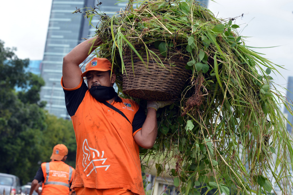 Petugas PPSU membersihkan saluran air di Kemang, Jakarta Selatan, Senin 29 Februari 2016. Foto: MI/Galih Pradipta