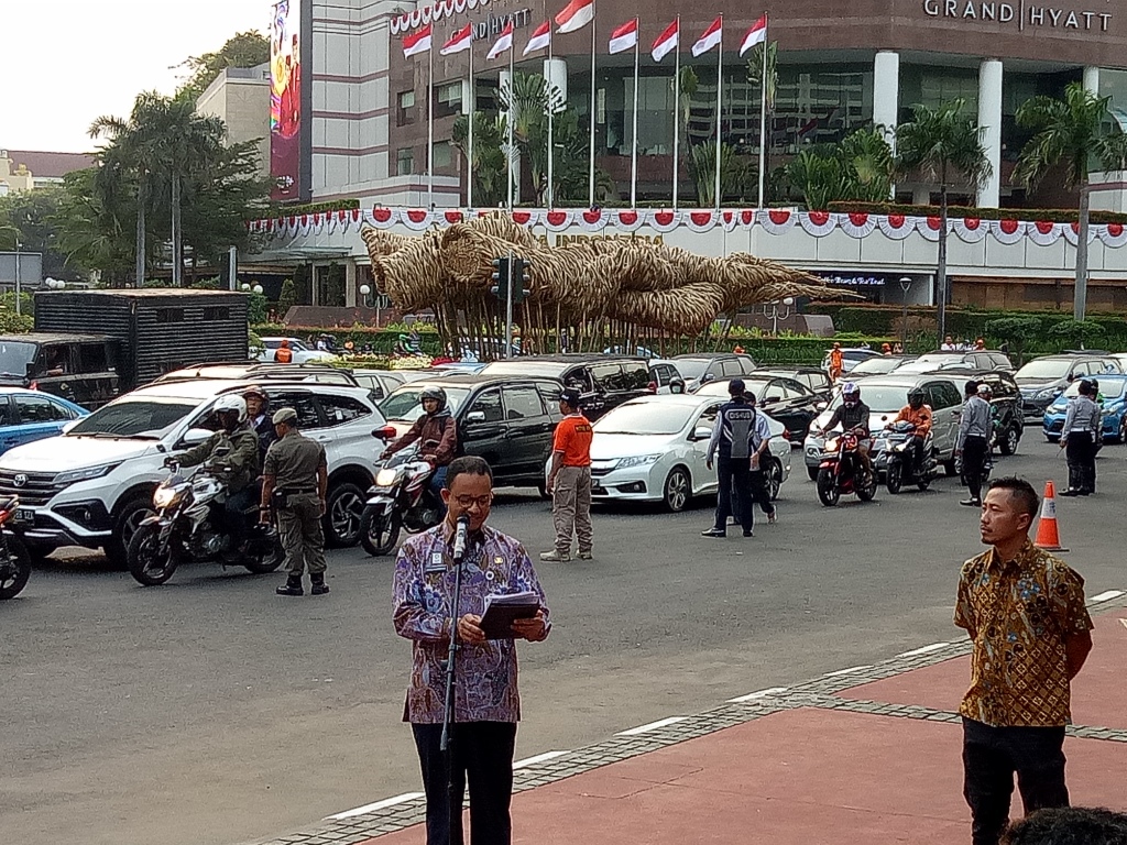 Jakarta: Gubernur DKI Jakarta Anies Baswedan meresmikan instalasi bambu yang terpasang di Bundaran Hotel Indonesia (HI). Karya seni yang dinamakan 'Getah Getih' itu menghabiskan biaya sebanyak Rp550 juta.