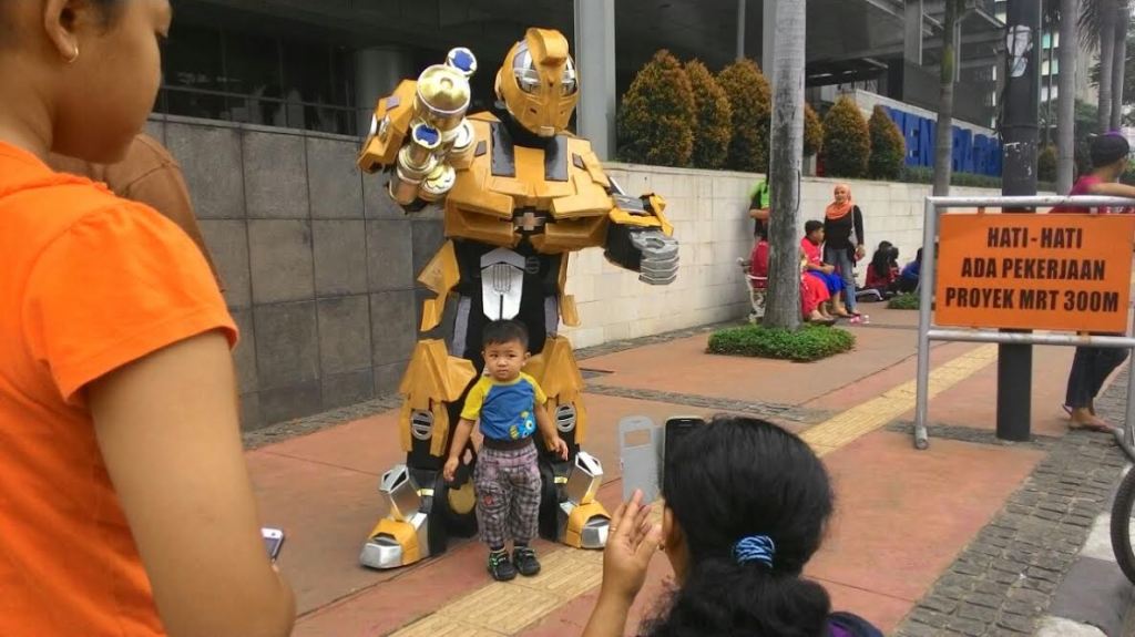 Bumbblee rupanya tengah mencari rezeki di Bundaran HI. Untuk dapat berfoto dengan tokoh robot Transformer itu, masyarakat hanya diminta membayar dengan sukarela. Tokoh di balik Bumblebee itu menyerahkan nasib rezekinya kepada yang berfoto.