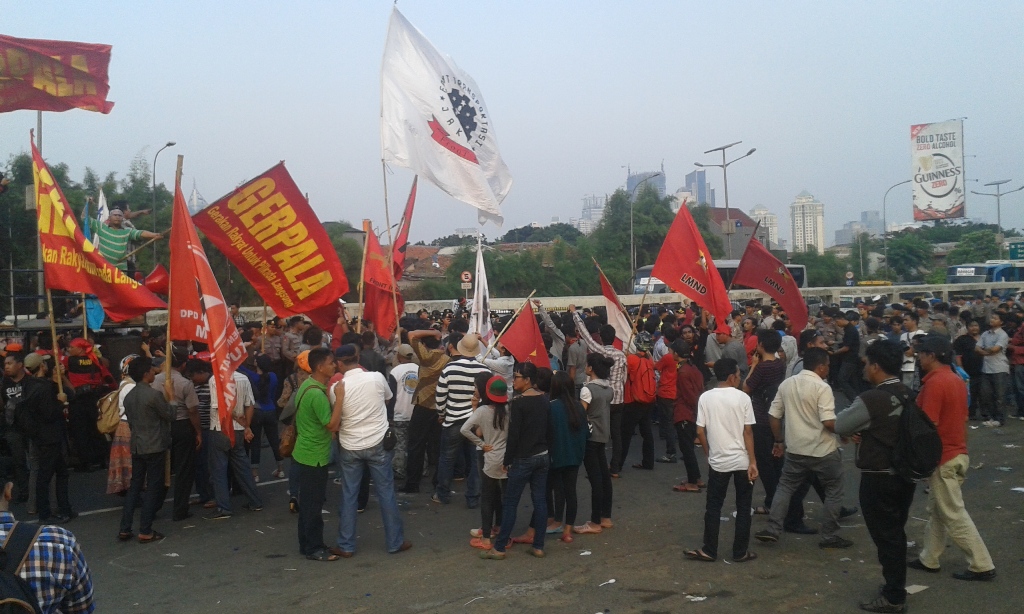 Unjuk rasa sempat tegang ketika sejumlah demonstran mulai membakar ban bekas. Bahkan sebagian pengunjuk rasa sempat bersenggolan dengan polisi karena dua kali coba menutup paksa jalan di depan Kompleks Parlemen.