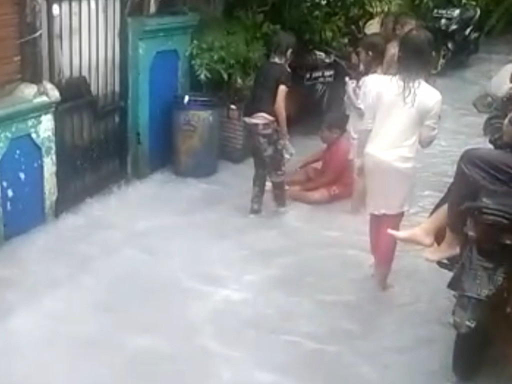 Dalam video amatir yang diunggah warga setempat, genangan berwarna putih seperti air susu itu diperkirakan setinggi 10 sentimeter. Video tersebut juga mengabadikan sejumlah anak bermain di tengah