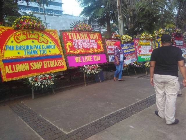 Balai Kota memang dipenuhi papan bunga sejak dua hari lalu. Semakin hari papan bunga dukungan untuk AHok -Djarot semakin banyak. Hingga hari ini masih terlihat mobil yang mengantar karangan bunga.