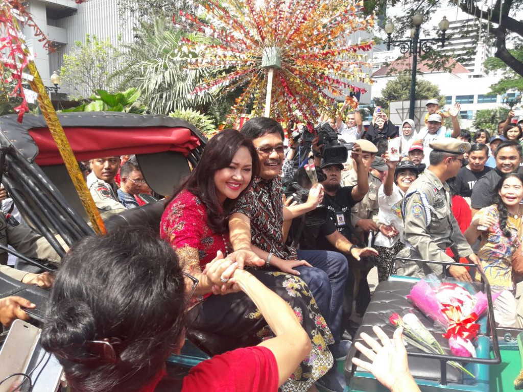 Djarot bersama istrinya Happy Farida digiring keluar Gedung Balai Kota menggunakan kereta kuda. Kepergian Djarot diiringi lagu-lagu Betawi dan ucapan selamat dari warga yang hadir. Djarot juga merima buket bunga dari warga.