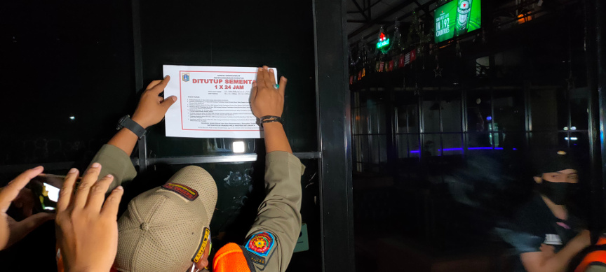 Jakarta Pusat menyegel lounge dan karaoke di Hotel California, Jalan Mangga Besar Raya, No 100 C, Sawah Besar, Jakarta. Tempat hiburan itu kedapatan melanggar Peraturan Gubernur Nomor 3 Tahun 2021 tentang Penanggulangan
