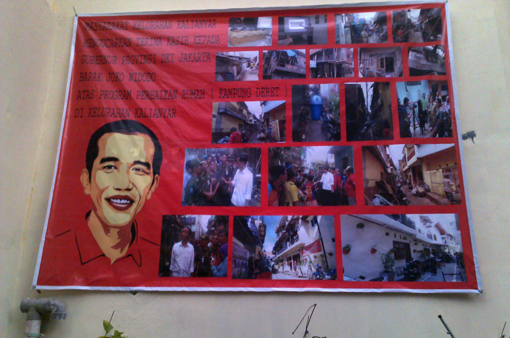Ucapan terima kasih warga atas keberhasilan program kampung deret Tambora, dituliskan pada sebuah baliho besar yang terpampang di sebuah tembok di sudut gang. Gambar Jokowi tampak memenuhi baliho dengan background berwarna merah.