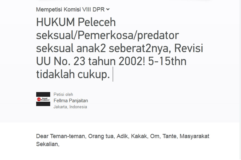 Baru Sehari, 20 ribu Orang Dukung Petisi Pelecehan Seksual Anak