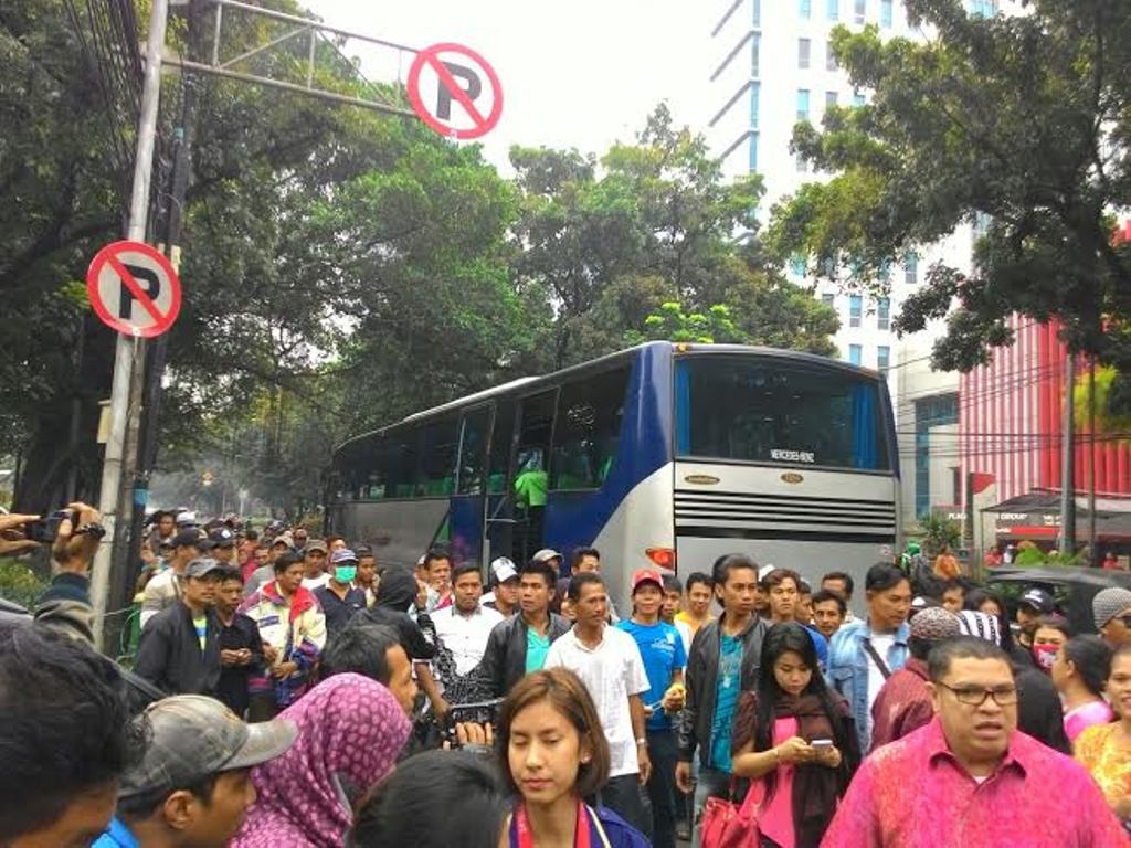 Ratusan warga Kalijodo tiba di depan Gedung DPRD Jakarta sekitar pukul 10.15 WIB, menumpang lima buah bus dan 20 mobil. Pantauan Metrotvnews.com, nampak sejumlah ibu menggendong balita.