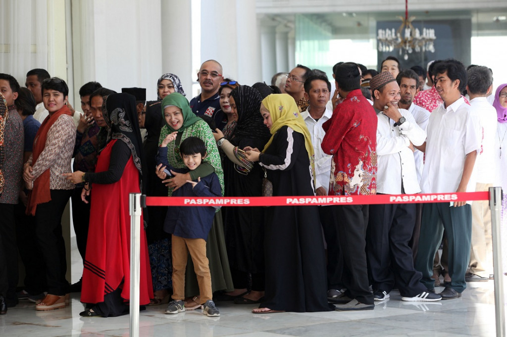 Jakarta: Presiden Joko Widodo menggelar open house di Istana Negara, Jakarta. Selain dengan pejabat dan pimpinan lembaga tinggi negara, presiden memberikan kesempatan kepada masyarakat umum untuk datang bersilaturahmi.