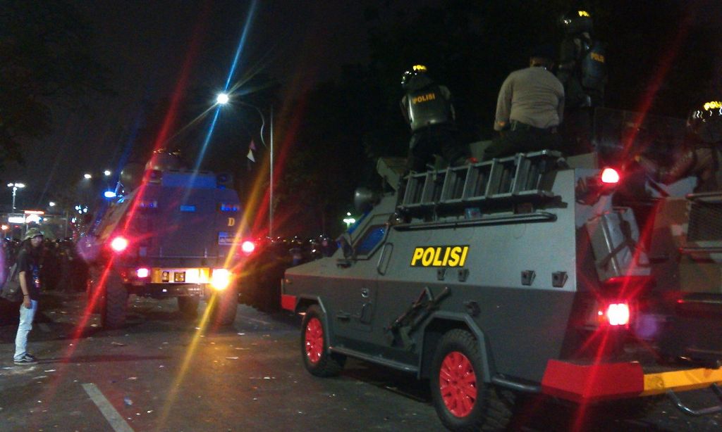 Dari pantauan di lokasi sekitar pukul 19.45 WIB, polisi mulai mendorong demonstran yang berada di Jalan Medan Merdeka Utara, Jakarta Pusat. Anggota kepolisian tersebut dilengkapi dengan pakaian antihuru-hara lengkap dengan tameng dan tiga mobil water canon.