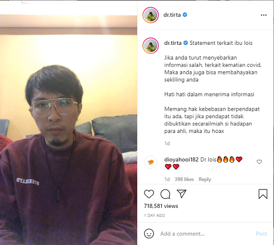 "Jika informasi yang disebarkan Ibu Louis tidak bisa dipertanggungjawabkan secara ilmiah, maka informasi tersebut bisa dikategorikan sebuah kebohongan," ujar Tirta.