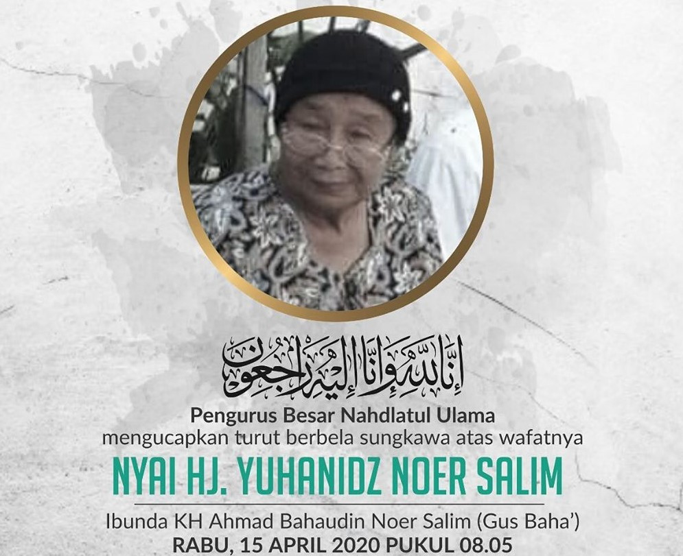"Telah wafat Ibunda Gus Baha, Ibu Nyai Hj. Yuhanidz Noer Salim pada hari Rabu, 15 April 2020, pukul 08.05 WIB," kata Ketua Pengurus Besar Nahdlatul Ulama (PBNU) Kiai Robikin Emhas kepada