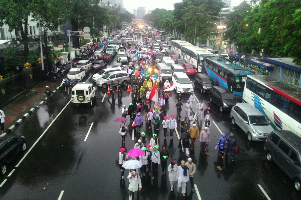 "Mobil pribadi, sepeda motor dan bis sudah memadati kawasan Tugu Tani. Kepadatan karena banyaknya kantong parkir kendaraan untuk massa doa bersama 112 di Masjid Istiqlal," kata Satria dalam breaking
