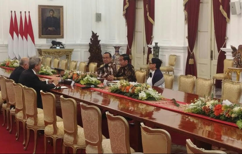 Jakarta: Presiden Joko Widodo menerima kunjungan kehormatan Ketua Komite Olympic Palestina, Jibril Mahmoud Muhammad Rajoub, di Istana Merdeka, Jakarta. Jokowi yakin perhelatan Asian Games ini bisa memberikan dampak positif bagi Palestina.