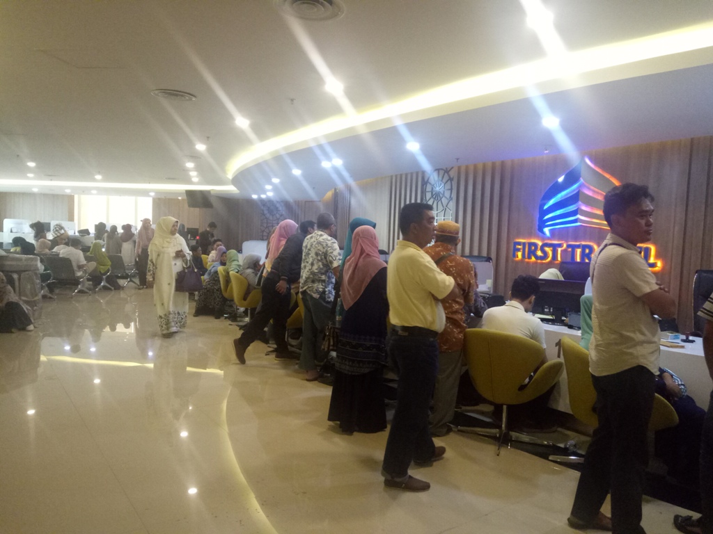 medcom.id, Jakarta: Kantor penyelenggara umrah, First Travel, di Lantai 16 Gedung GKM, Jalan T.B. Simatupang, Jakarta Selatan, tetap dipadati para konsumennya. Mereka mengantre untuk membayar biaya tambahan sebagai komitmen memelihara harapan berangkat ke Tanah Suci.