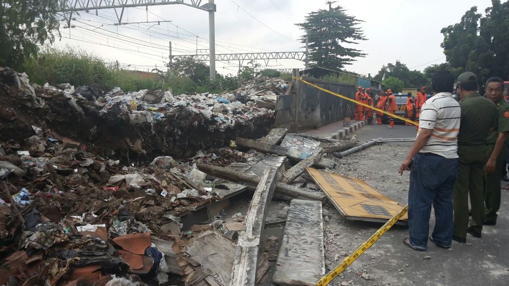 Ketiga korban, kata Purwanta, tengah melintas di trotoar saat tembok pembatas itu roboh. Tembok setinggi dua meter itu roboh akibat desakan tumpukan sampah yang menggunung di tepi rel.