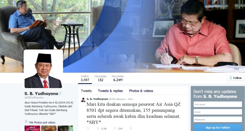 "Mari kita doakan semoga pesawat AirAsia QZ 8501 dapat segera ditemukan, 155 penumpang serta seluruh awak kabin dalam keadaan selamat. *SBY*," kata SBY dalam akun Twitternya, Minggu (28/12/2014).
