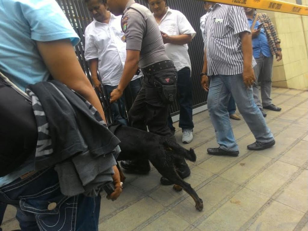 Sekitar 10 menit, seorang petugas polisi menenteng selembar tisu yang didekatkan ke hidung anjing pelacak. Tak lama anjing tersebut kemudian berlari sekitar 500 meter.
